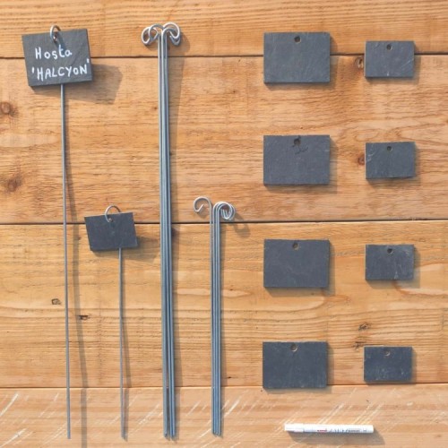 Un lot d'étiquettes en ardoise solide et durable avec leurs supports pour marquer, repérer et identifier les plantes d'un massif. Un feutre peinture pour un marquage durable. 2 formats au choix