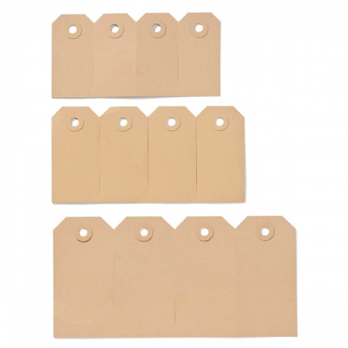 Étiquettes américaines en cartonnette, façon papier kraft épais avec œillets en papier, elles sont conditionnées en planches prédécoupées.