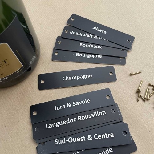Étiquettes de cave pour créer un repérage visuel par région vinicole. Découpées et gravées au laser par notre atelier, le marquage est très lisible.