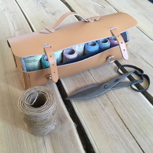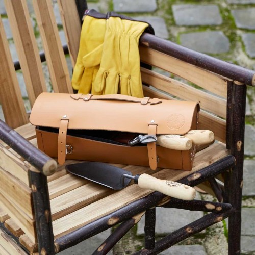 Cette mallette à outils de jardin se transporte facilement grâce à sa poignée en cuir.