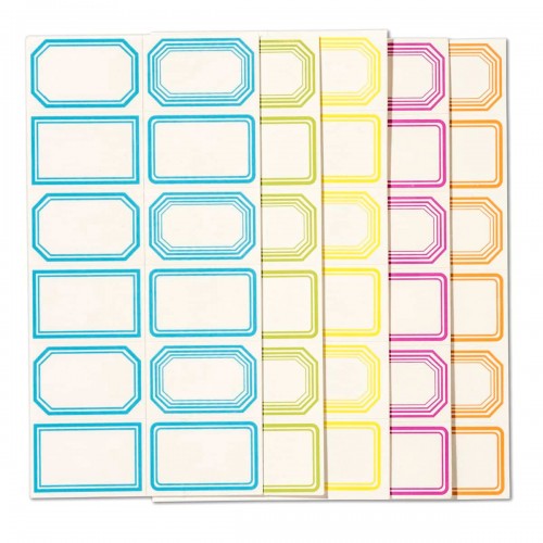 Bleu, vert, jaune, rose ou orange... Les étiquettes en papier sont proposées avec des traits d'encadrement aux couleurs acidulées ! Elles se décollent facilement sur les pots en verre.