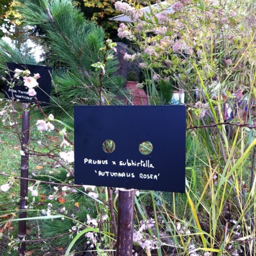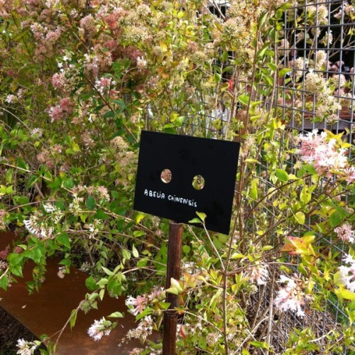 Une grande étiquette, masque en métal, avec deux ouvertures permettant aux visiteurs d'observer, de regarder et de découvrir la plante identifiée au travers du masque.