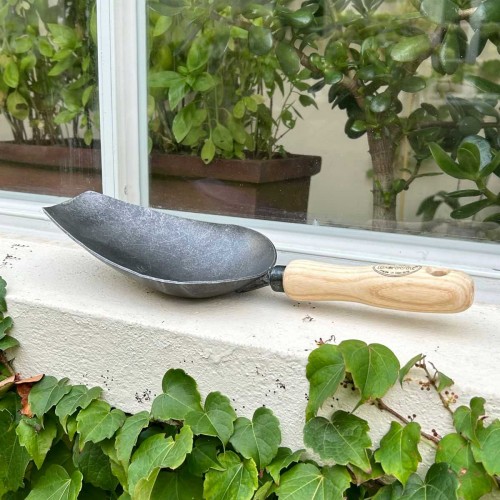 Cette pelle se glisse facilement dans un sac de terreau et permet des apports précis pour le surfaçage des potées.